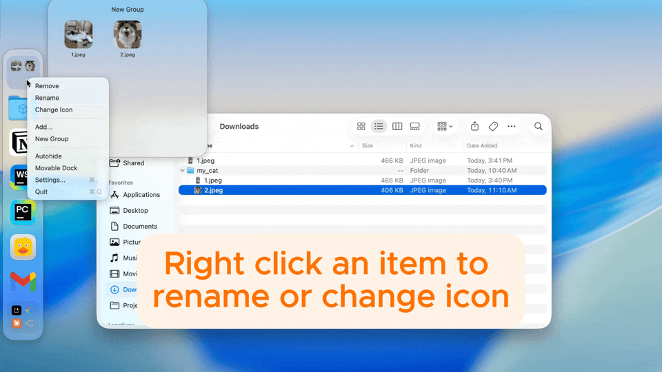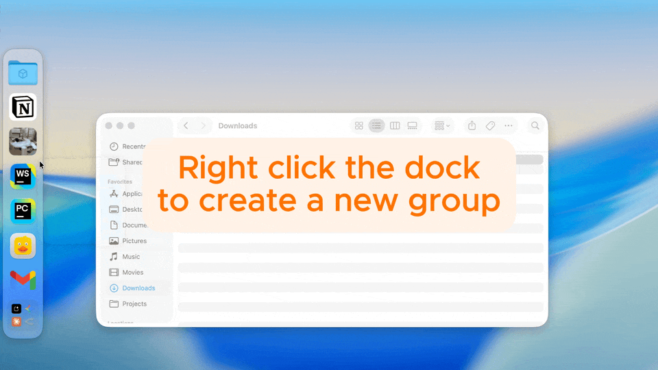 Keep your Dock clean and organized. Right-click to create a group, then drag items into it for better organization.